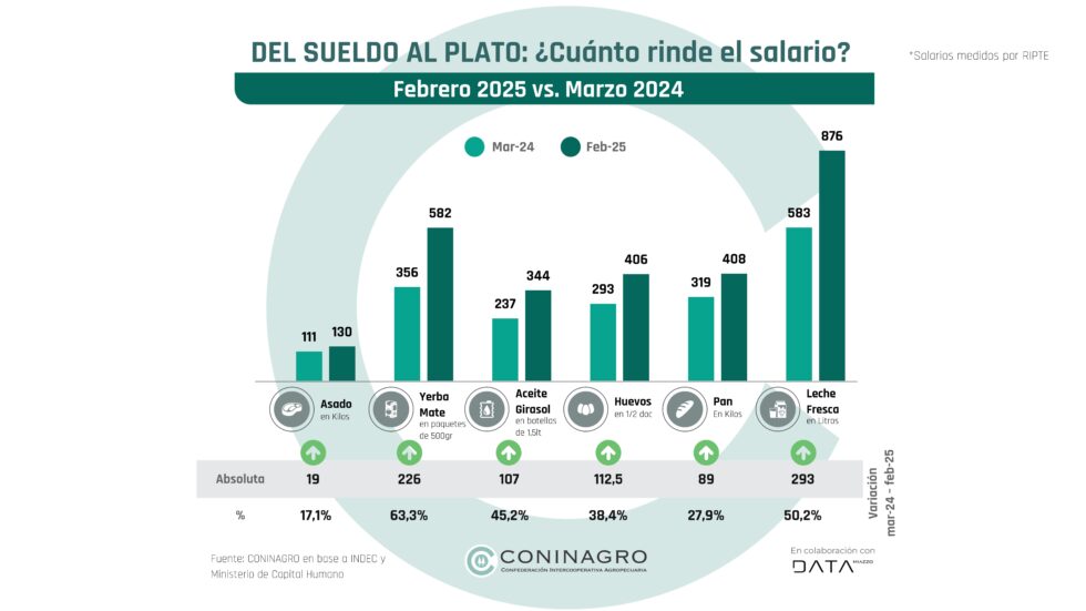 Entre marzo de 2024 y febrero de 2025, el salario medido por RIPTE ganó poder de compra frente a los seis alimentos básicos que monitorea CONINAGRO en este informe: aceite de girasol, yerba mate, leche, asado, huevo y pan.