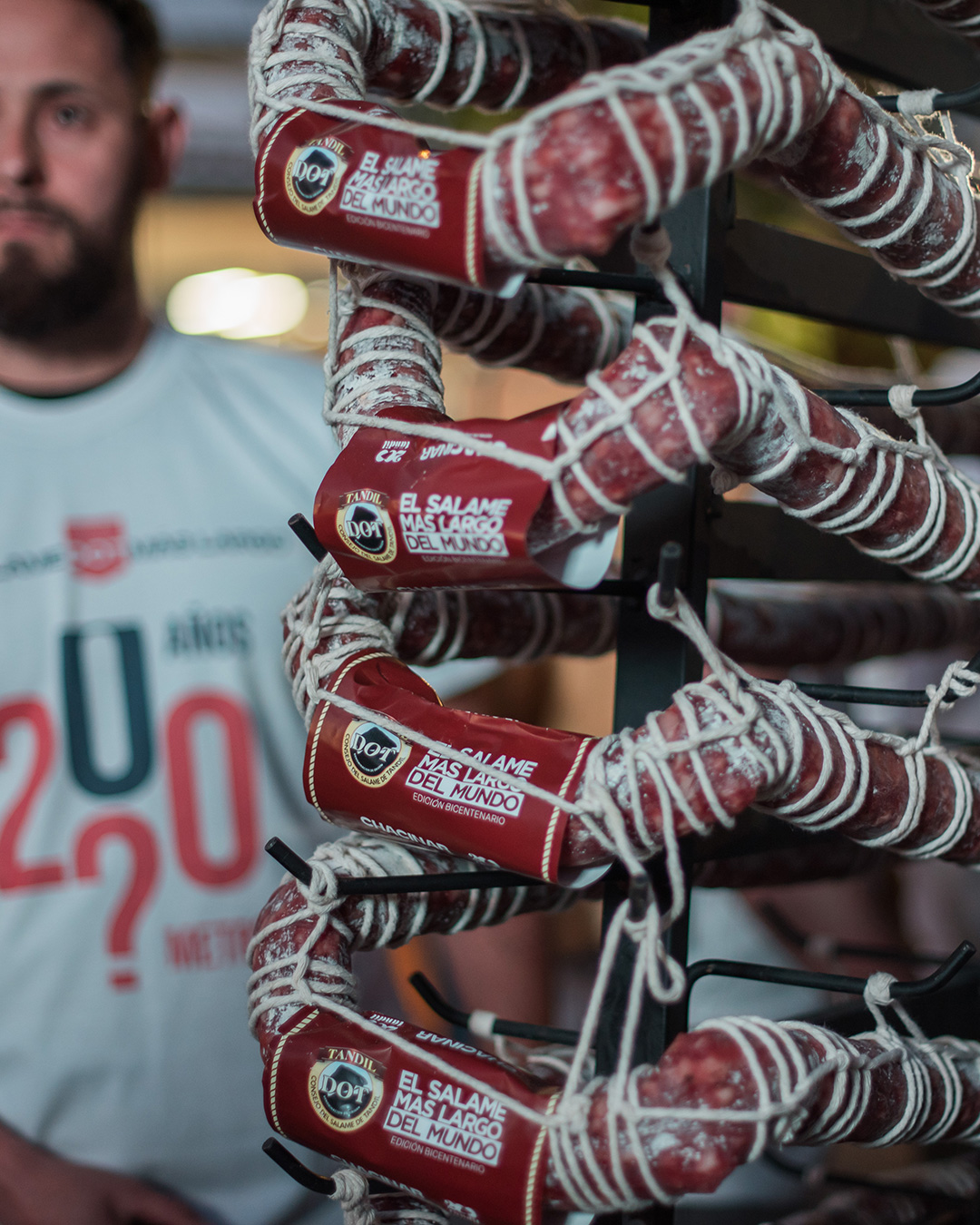 Para elaborar el salame más largo del mundo se utilizan cientos de kilos de carne fresca y más de 50 personas participan en cada etapa: embutido, estacionamiento, traslado y degustación. El primero, en 2014, midió apenas 16 metros, pero año tras año la cifra fue creciendo hasta superar los 400 metros. “Esto es el resultado de años de trabajo y de poner en valor la cultura chacinera, un símbolo de Tandil y del sentimiento colectivo de los argentinos”, subrayó Juana Echezarreta, presidenta del DOT.